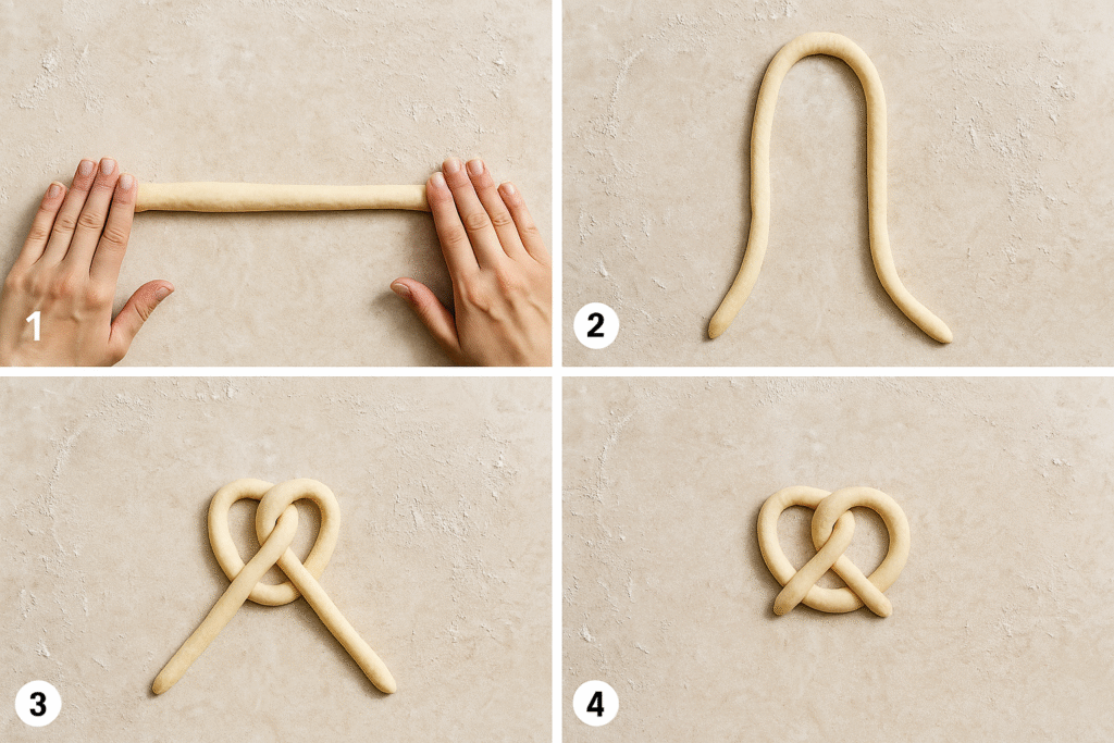 Create a “U” shape, twist the ends once, and fold them down to form a classic pretzel.